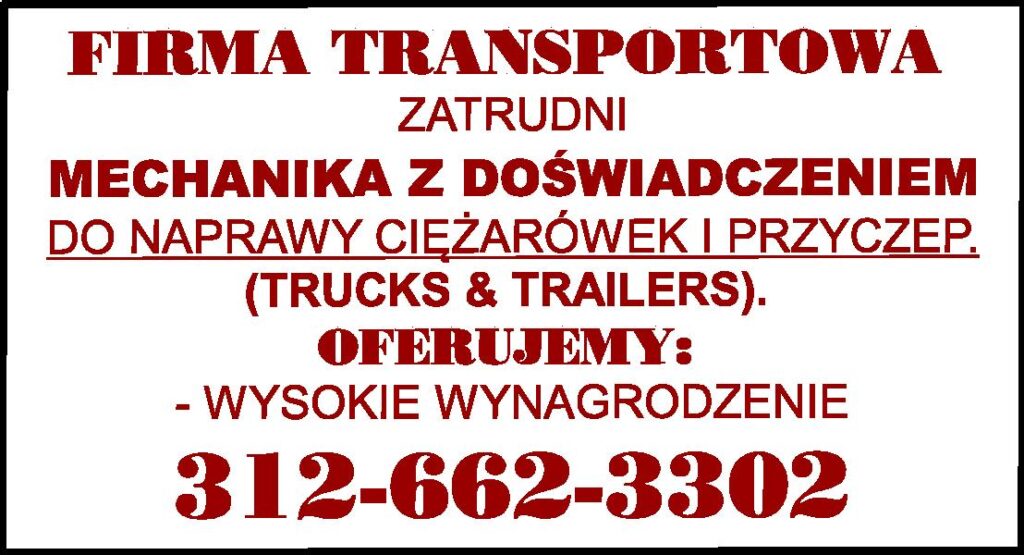 FIRMA TRANSPORTOWA ZATRUDNI MECHANIKA Z DOŚWIADCZENIEM, DO NAPRAWY CIĘŻARÓWEK I PRZYCZEP. (TRUCKS & TRAILERS). OFERUJEMY: WYSOKIE WYNAGRODZENIE. 312-662-3302