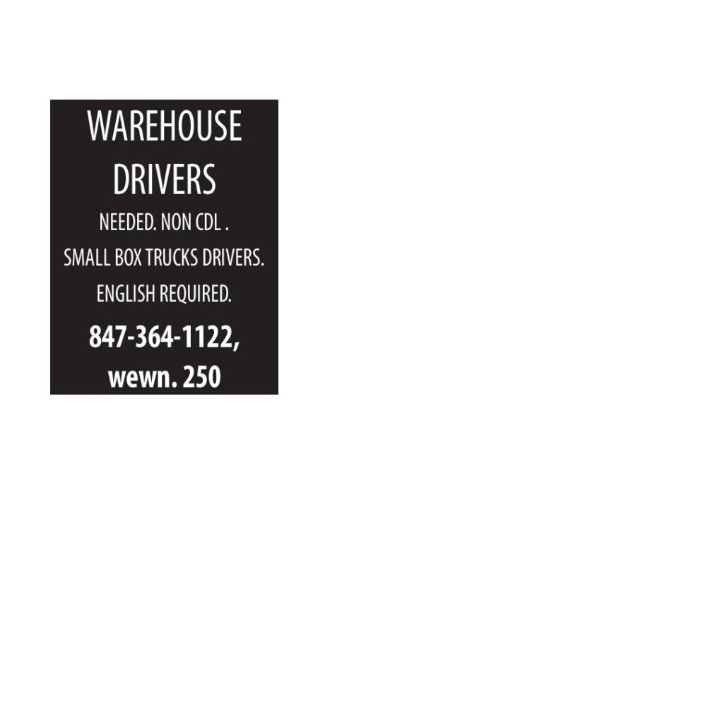 WAREHOUSE DRIVERS NEEDED. NON CDL . SMALL BOX TRUCKS DRIVERS. ENGLISH REQUIRED. 847-364-1122, wewn. 250
