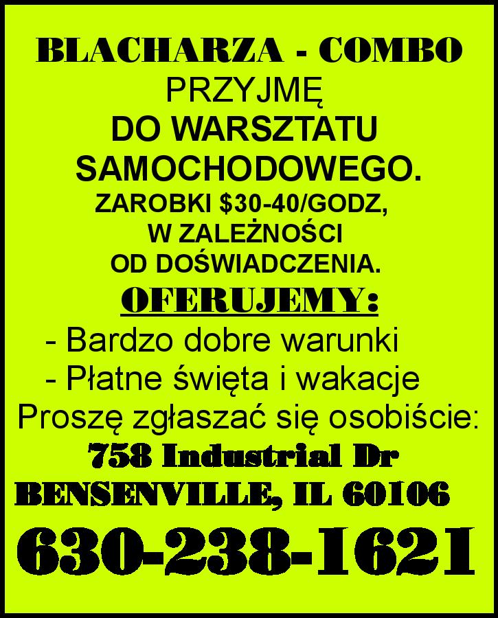 BLACHARZA - COMBO PRZYJMĘ DO WARSZTATU SAMOCHODOWEGO. ZAROBKI $30-40/GODZ, W ZALEŻNOŚCI OD DOŚWIADCZENIA. OFERUJEMY: - Bardzo dobre warunki - Płatne święta i wakacje Proszę zgłaszać się osobiście: 758 Industrial Dr […]