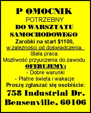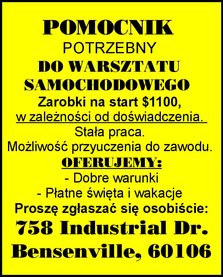 POMOCNIK POTRZEBNY DO WARSZTATU SAMOCHODOWEGO. Zarobki na start $1100, w zależności od doświadczenia. Stała praca. Możliwość przyuczenia do zawodu. OFERUJEMY: - Dobre warunki - Płatne święta i wakacje Proszę zgłaszać się osobiście: 758 Industrial Dr. Bensenville, IL 60106