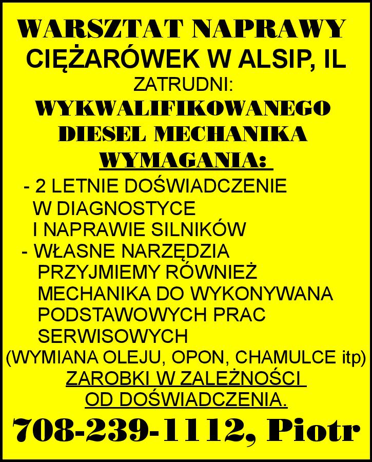 z doświadczeniem do warsztatu naprawy ciężarówek w Bridgeview, IL potrzebny. Bardzo dobre warunki. 708-940-2089 Dzwoń 8 am – 4.30 pm od pon. do pt.