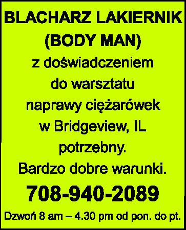 FIRMA TRANSPORTOWA W BRIDGEVIEW zatrudni MENEDŻERA WARSZTATU NAPRAWY CIĘŻARÓWEK. Doświadczenie w zarządzaniu ludźmi i warsztatem konieczne. 708-940-2089 Dzwoń 8 am - 4.30 pm od pon. do pt.