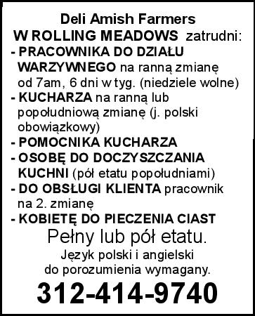 DELI 4 YOU W NORRIDGE, IL ZATRUDNI OSOBĘ DO PRZYGOTOWANIA DAŃ MĄCZNYCH. Pełny etat. OFERUJEMY: - Dobre wynagrodzenie - Płatne wakacje - Ubezpieczenie zdrowotne - Możliwość dodatkowych godzin Proszę zgłaszać się osobiście 8 am - 3 pm Pytać o Dawida. 708-457-1700