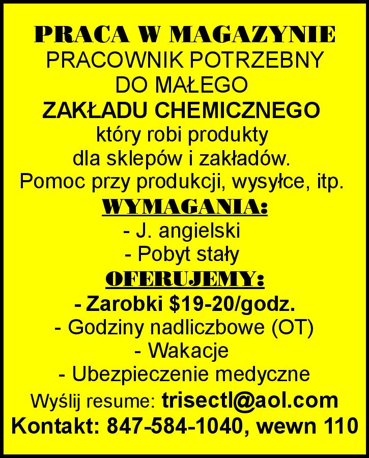 PRACA W MAGAZYNIE PRACOWNIK POTRZEBNY, DO MAŁEGO ZAKŁADU CHEMICZNEGO POTRZEBNY, który robi produkty dla sklepów i zakładów. Pomoc przy produkcji, wysyłce, itp. WYMAGANIA: - J. angielski - Pobyt stały OFERUJEMY: - Zarobki $19-20/godz. - Godziny nadliczbowe (OT) - Wakacje - Ubezpieczenie […]