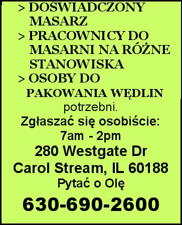 DOŚWIADCZONY MASARZ PRACOWNICY DO MASARNI NA RÓŻNE STANOWISKA OSOBY DO PAKOWANIA WĘDLIN potrzebni. Zgłaszać się: 7am - 2pm 280 Westgate Dr Carol Stream, IL 60188 Pytać o Olę 630-690-2600