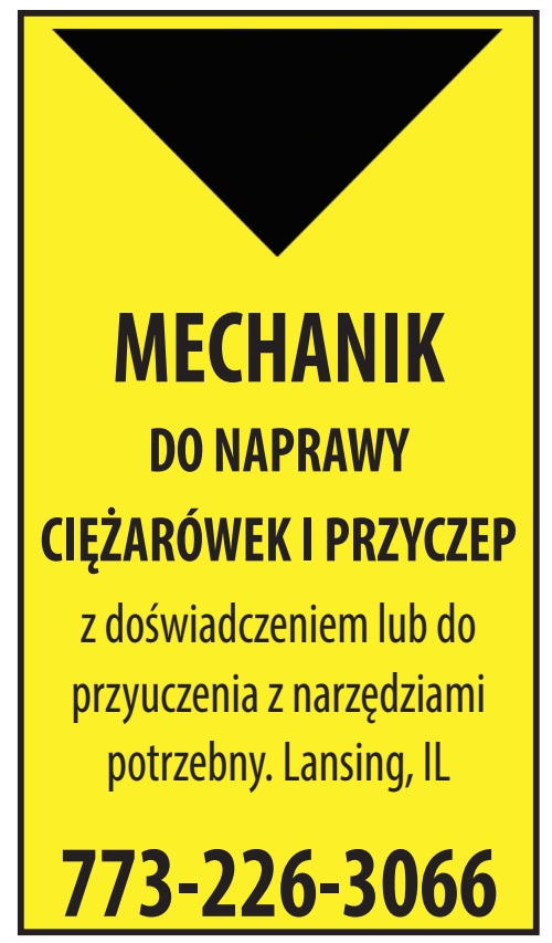 FIRMA TRANSPORTOWA ZATRUDNI MECHANIKÓW I POMOCNIKÓW DO NAPRAWY CIĘŻARÓWEK I PRZYCZEP. Praca od poniedziałku do soboty. OFERUJEMY: - Czyste, jasne i ciepłe pomieszczenie - Przyjemną atmosferę w pracy BRIDGEVIEW, IL 773-719-4858 773-656-6982