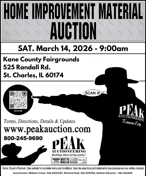 HOME IMPROVEMENT MATERIAL AUCTION SAT. March 14, 2026 – 9:00am Kane County Fairgrounds 525 Randall Rd. St. Charles, IL 60174 SCAN ME SCAN It! Terms, Directions, Details & Updates www.peakauction.com 800-245-9690 PEAK AUCTIONEERING Kansas City PEAK AUCTIONEERING Building Material S […]