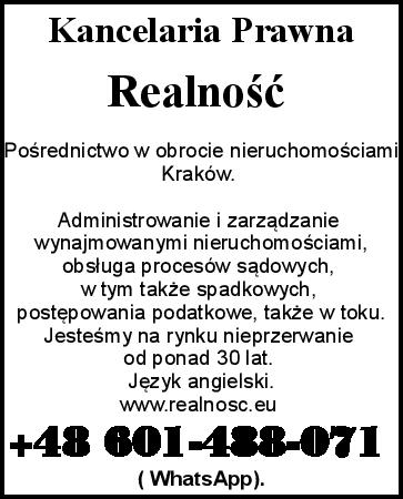 Kancelaria Prawna „Realność” Pośrednictwo w Obrocie Nieruchomościami Kraków, administrowanie i zarządzanie wynajmowanymi nieruchomościami, obsługa procesów sądowych , w tym także spadkowych, postępowania podatkowe, także w toku, język angielski, jesteśmy na rynku nieprzerwanie od ponad 30 […]