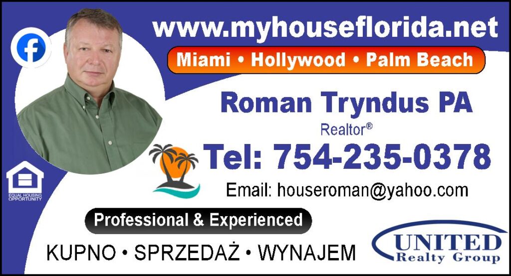 www.myhouseflorida.net Miami. Hollywood. Palm Beach Roman Tryndus PA Realtor Tel: 754-235-0378 Email: [email protected] Professional & Experienced KUPNO. SPRZEDAŻ. WYNAJEM UNITED Realty Group EQUAL HOUSING OPPORTUNITY