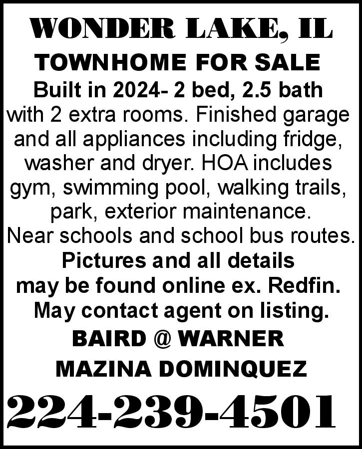 WONDER LAKE, IL TOWMHOME FOR SALE Built in 2024- 2 bed, 2.5 bath with 2 extra rooms. Finished garage and all appliances including fridge, washer and dryer. HOA includes gym, swimming pool, walking trails, park, exterior maintenance. Near schools and school bus routes. Pictures and all d […]