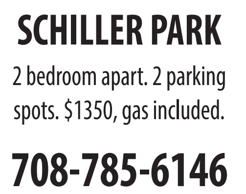 2 bedroom apartment. 2 parking spots. $1350, gas included. 708-785-6146