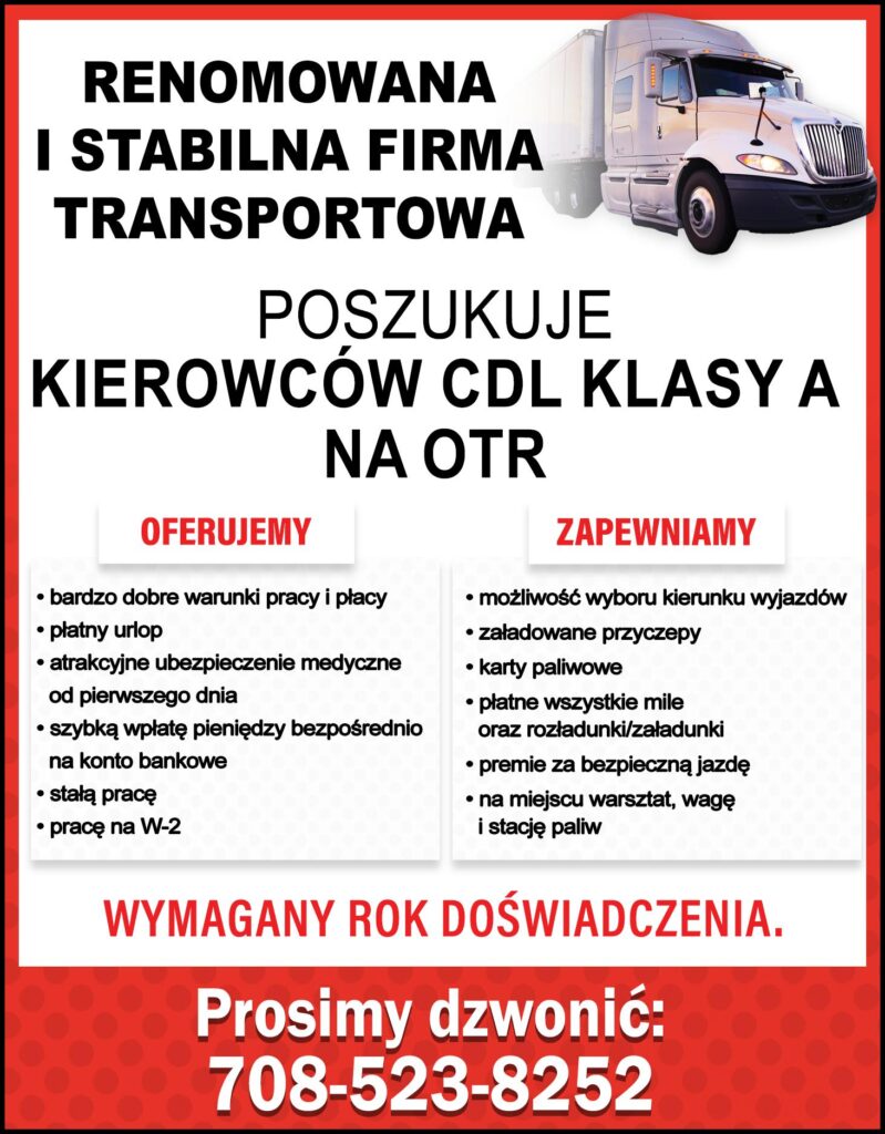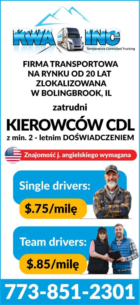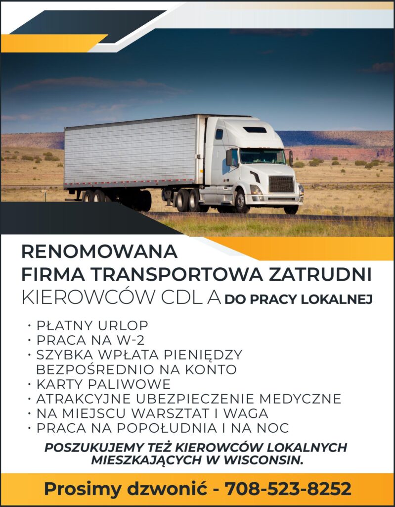 Firma transportowa zatrudni WŁAŚCICIELI CIĘŻARÓWEK Z PRZYCZEPAMI. Trasy OTR. TEAM KIEROWCÓW CDL KL. A Trasy na Midwest. $0.75/milę & do AZ, CA, WA, FL, TX - $0.70/milę. Karty paliwowe. Dobre warunki pracy. Regularne wypłaty. Baza w Park City. 773-304-6031 224-599-6001