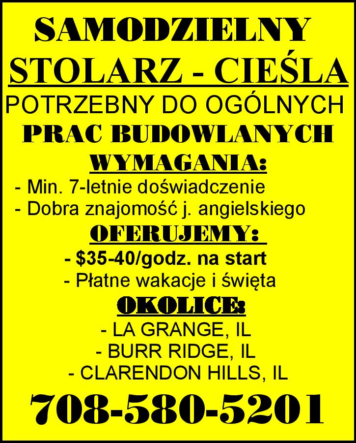 SAMODZIELNY STOLARZ - CIEŚLA POTRZEBNY DO OGÓLNYCH PRAC BUDOWLANYCH. WYMAGANIA: - Min. 7-letnie doświadczenie - Dobra znajomość j. angielskiego OFERUJEMY: - $35-40/godz. na start - Płatne wakacje i święta OKOLICE: - LA GRANGE, IL - BURR RIDGE, IL - CLARENDON HILLS, IL 708-580-5201