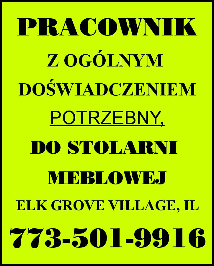 PRACOWNIK Z OGÓLNYM DOŚWIADCZENIEM POTRZEBNY, DO STOLARNI MEBLOWEJ. ELK GROVE VILLAGE, IL 773-501-9916