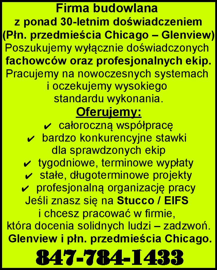 Firma budowlana z ponad 30-letnim doświadczeniem (Północne przedmieścia Chicago – Glenview) Poszukujemy wyłącznie doświadczonych fachowców oraz profesjonalnych ekip. Pracujemy na nowoczesnych systemach i oczekujemy wysokiego standardu wykonania. Oferujemy: ✔ całoroczną współpracę ✔ bardzo […]