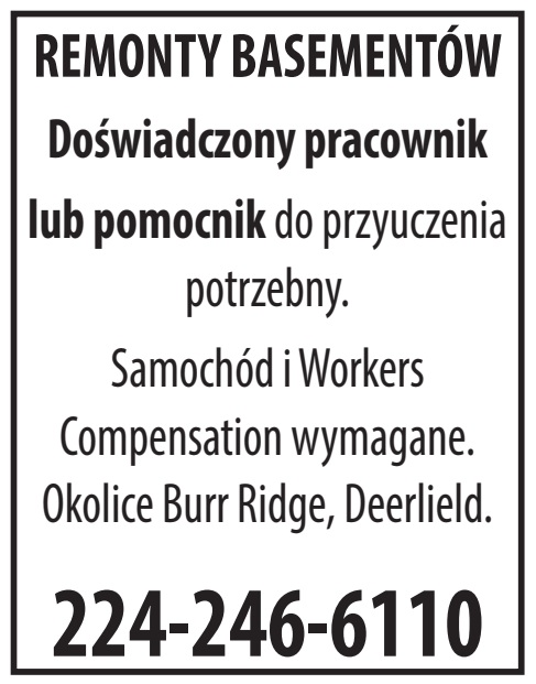 Doświadczony pracownik lub pomocnik do przyuczenia potrzebny. Samochód i Workers Compensation wymagane. Okolice Burr Ridge, Deerlield. 224-246-6110