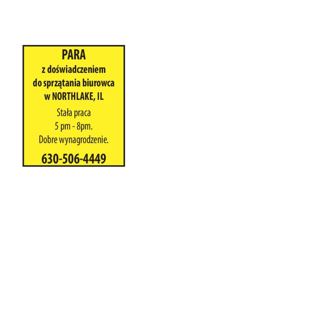 PARA z doświadczeniem do sprzątania biurowca w NORTHLAKE, IL Stała praca, 5 pm - 8pm. Dobre wynagrodzenie. 630-506-4449