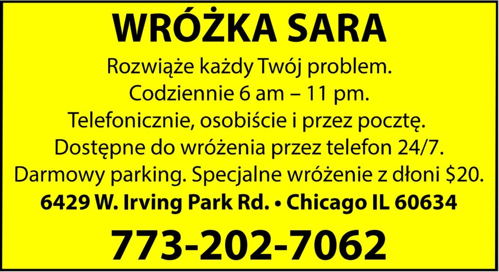 WRÓŻKA SARA Rozwiąże każdy Twój problem. Codziennie 6 am – 11 pm. Telefonicznie, osobiście i przez pocztę. Dostępne do wróżenia przez telefon 24/7. Darmowy parking. Specjalne wróżenie z dłoni $20. 6429 W. Irving Park Rd. • Chicago IL 60634 773-202-7062