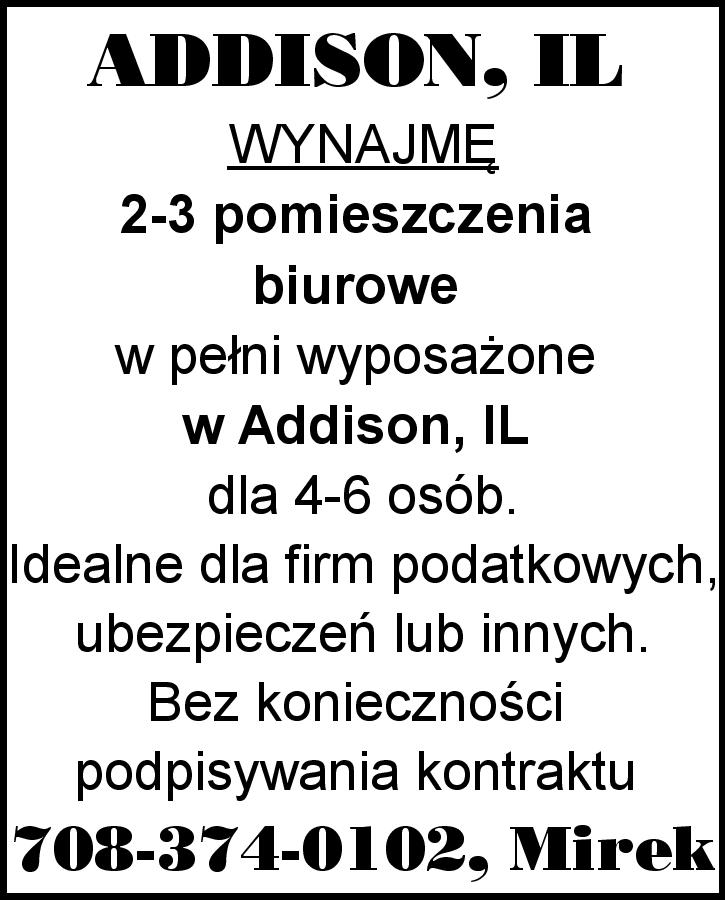 Wynajmę 2-3 pomieszczenia biurowe w pełni wyposażone w Addison IL dla 4-6 osób.