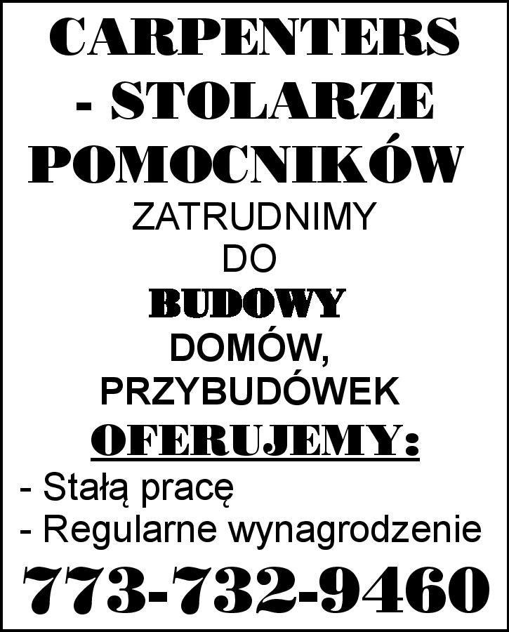 CARPENTERS - STOLARZE utworzone przez Czesia | paź 29, 2025 Budowlana CARPENTERS - STOLARZE Dodał:Czesia 10/29/2025 Opis ogłoszeniaCARPENTERS – STOLARZE POMOCNIKÓW ZATRUDNIMY DO BUDOWY DOMÓW, PRZYBUDÓWEK OFERUJEMY: – Stałą pracę – Regularne wynagrodzenie 773-732-9460 Udostępnij: Telefon(773) 732 9460 Udostępnij: