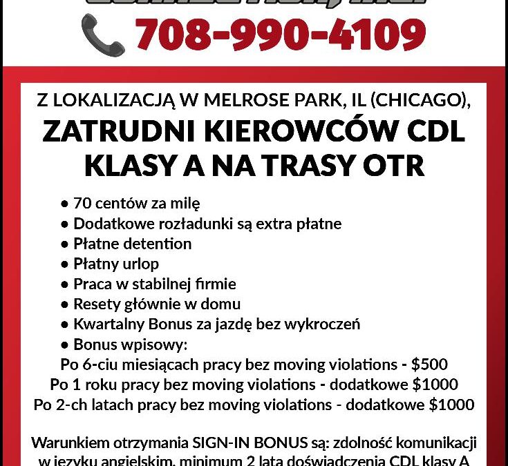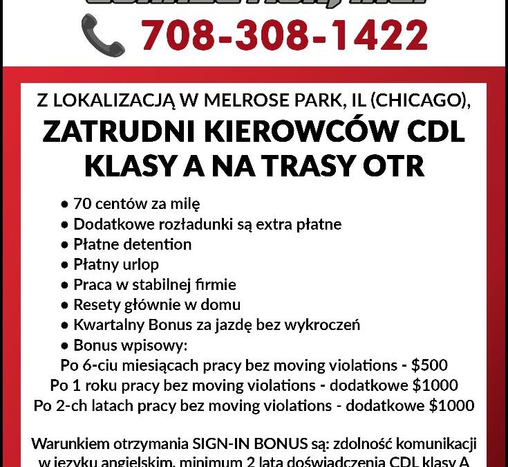 Warunkiem otrzymania SIGN-IN BONUS są: zdolność komunikacji w języku angielskim, minimum 2 lata doświadczenia CDL klasy A w USA, oraz obywatelstwo lub zielona karta.