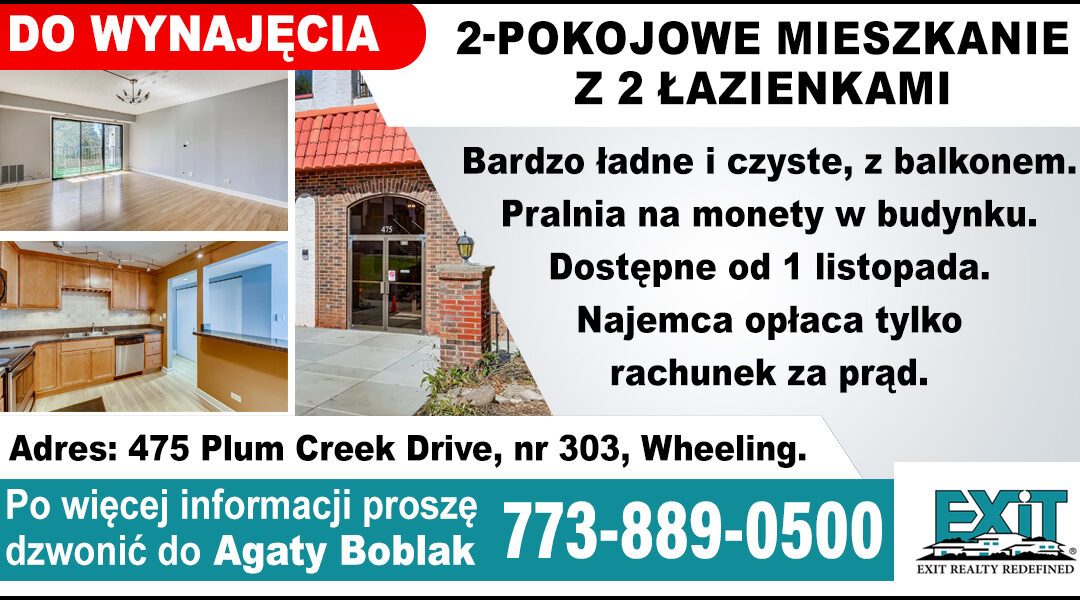 Po więcej informacji proszę dzwonić do Agaty Boblak pod numer 773-889-0500, EXIT Realty Redefined.