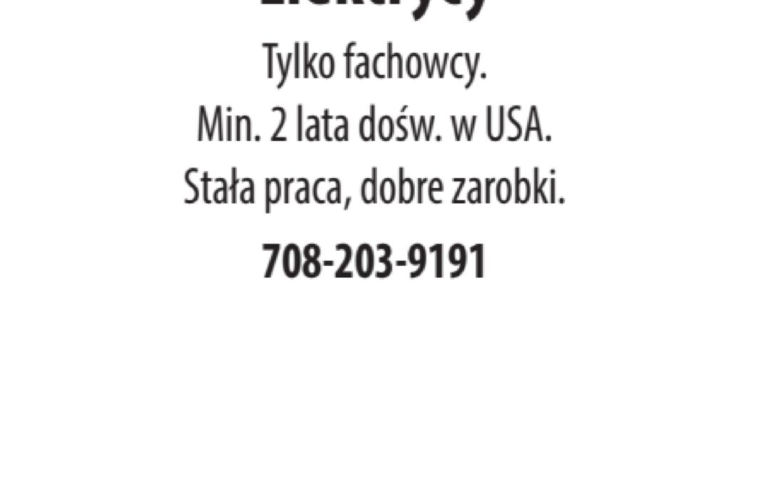 Elektrycy utworzone przez NewsReporting | lut 12, 2026 Budowlana Elektrycy Dodał:NewsReporting 02/12/2026 Opis ogłoszeniaTylko fachowcy. Min. 2 lata dośw. w USA. Stała praca, dobre zarobki. 708-203-9191 Telefon(708) 203 9191 Udostępnij:
