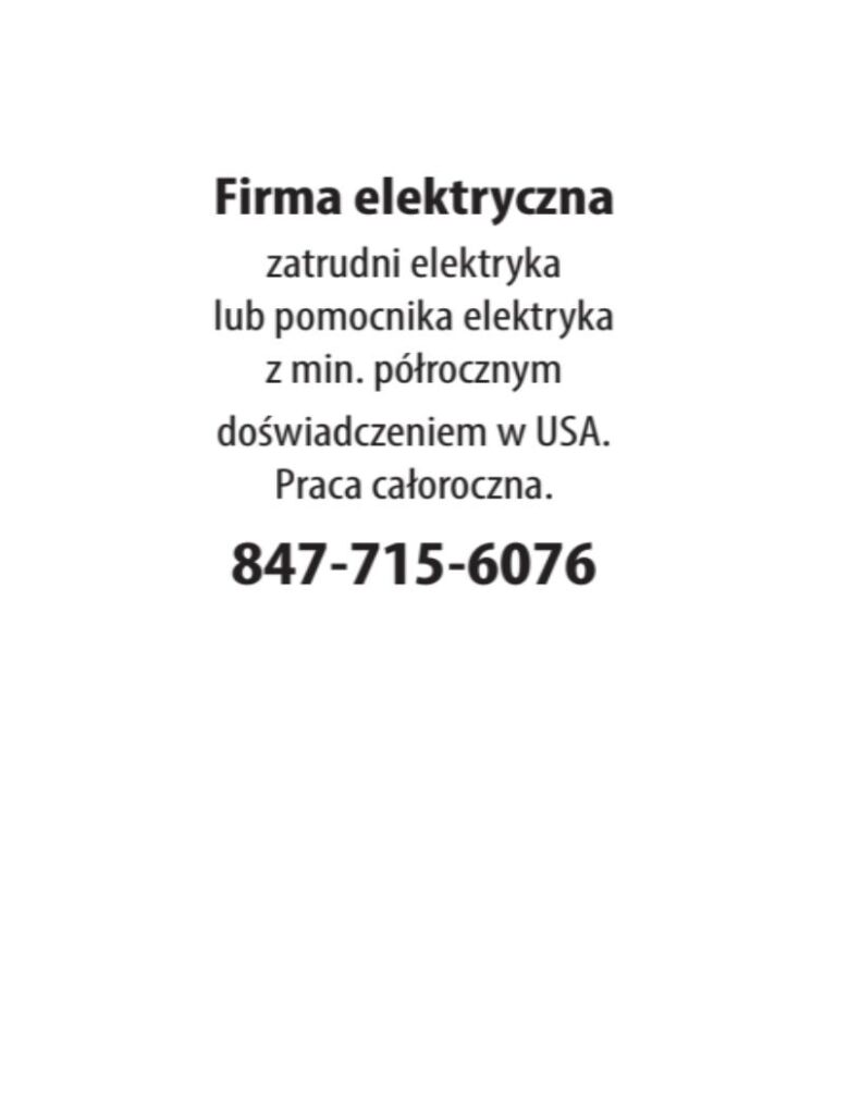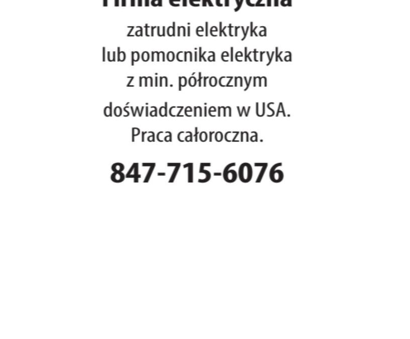 Firma elektryczna zatrudni elektryka lub pomocnika elektryka utworzone przez NewsReporting | lis 10, 2025 Budowlana Firma elektryczna zatrudni elektryka lub pomocnika elektryka Dodał:NewsReporting 11/10/2025 Opis ogłoszeniaz min. półrocznym doświadczeniem w USA. Praca całoroczna. 847-715-6076 Udostępnij: Telefon(847) 715 6076 Udostępnij:
