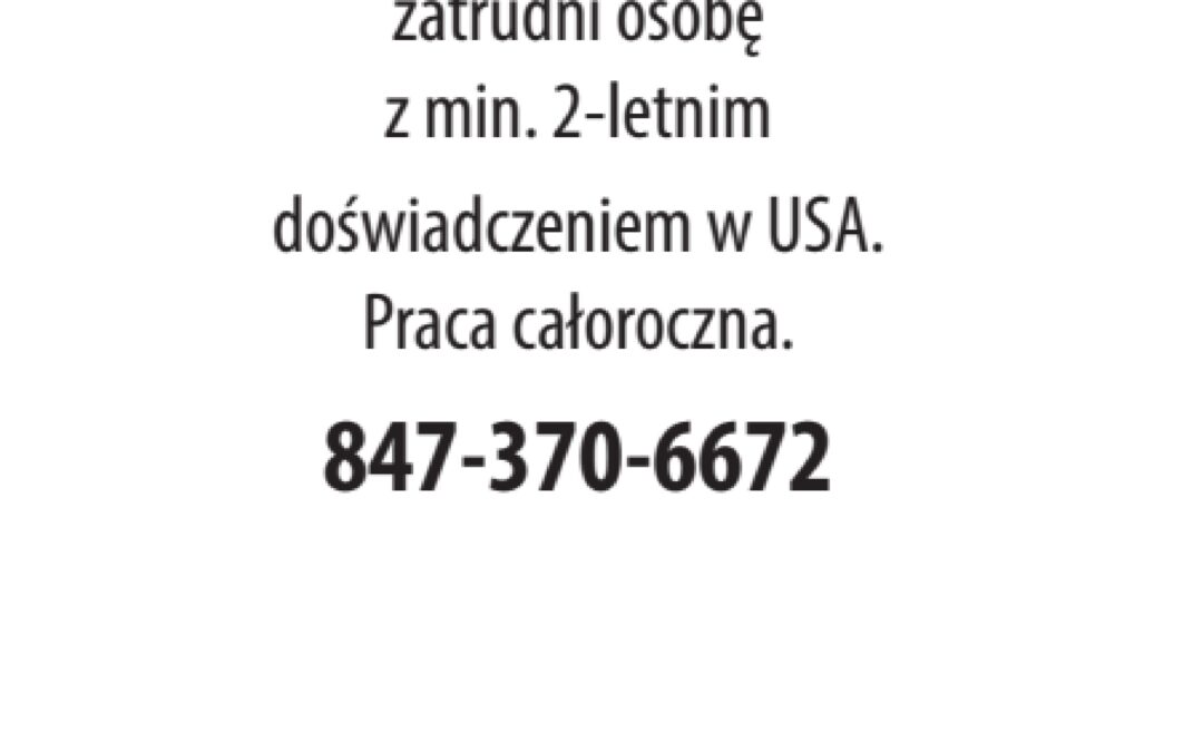 Firma elektryczna zatrudni osobę utworzone przez NewsReporting | sty 16, 2026 Budowlana Firma elektryczna zatrudni osobę Dodał:NewsReporting 01/16/2026 Opis ogłoszeniaz min. 2-letnim doświadczeniem w USA. Praca całoroczna. 847-370-6672 Udostępnij: Telefon(847) 370 6672 Udostępnij: