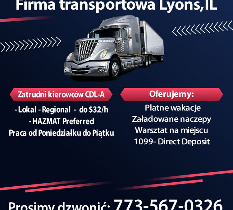 FIRMA TRANSPORTOWA W LYONS, IL utworzone przez QualityClassifiedArt | gru 23, 2025 Dla kierowców FIRMA TRANSPORTOWA W LYONS, IL Dodał:QualityClassifiedArt 12/23/2025 Opis ogłoszeniazatrudni KIEROWCÓW CDL – A Lokalna, Regionalna do $32/godz. Hazmat preffered. Praca od poniedziałku do piątku. Oferujemy: > Płatne wakacje, > Załadowane naczepy, Warsztat na miejscu, > 1099 – direct deposit. Prosimy dzwonić: 773-567-0326 Udostępnij: Telefon(773) 567 0326 Udostępnij:
