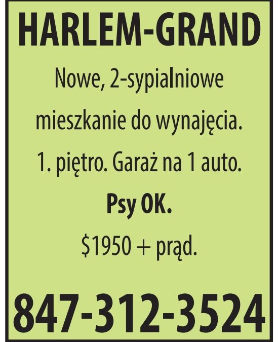 HARLEM-GRAND utworzone przez QualityClassifiedArt | gru 24, 2025 Do wynajęcia HARLEM-GRAND Dodał:QualityClassifiedArt 12/24/2025 Opis ogłoszeniaNowe, 2-sypialniowe mieszkanie do wynajęcia. 1. piętro. Garaż na 1 auto. Psy OK. $1950 + prąd. 847-312-3524 Udostępnij: Telefon(847) 312 3524 Udostępnij: