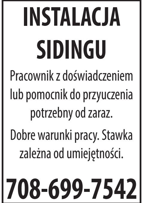 INSTALACJA SIDINGU utworzone przez QualityClassifiedArt | sty 29, 2026 Budowlana INSTALACJA SIDINGU Dodał:QualityClassifiedArt 01/29/2026 Opis ogłoszeniaPracownik z doświadczeniem lub pomocnik do przyuczenia potrzebny od zaraz. Dobre warunki pracy. Stawka zależna od umiejętności. 708-699-7542 Telefon(708) 699 7542 Udostępnij: