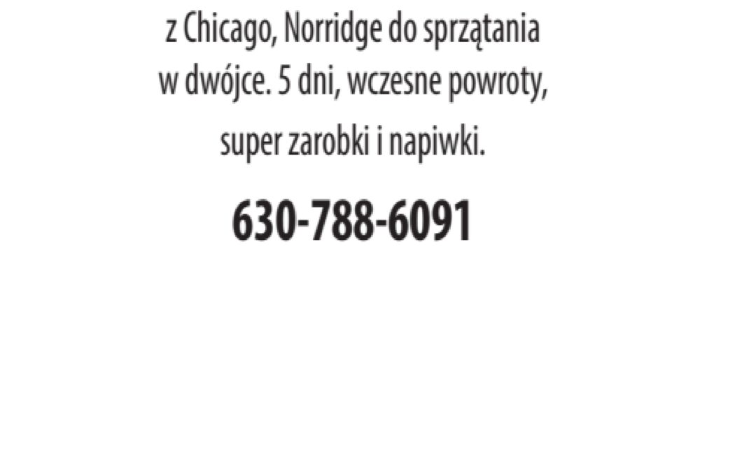 z Chicago, Norridge do sprzątania w dwójce. 5 dni, wczesne powroty, super zarobki i napiwki. 630-788-6091