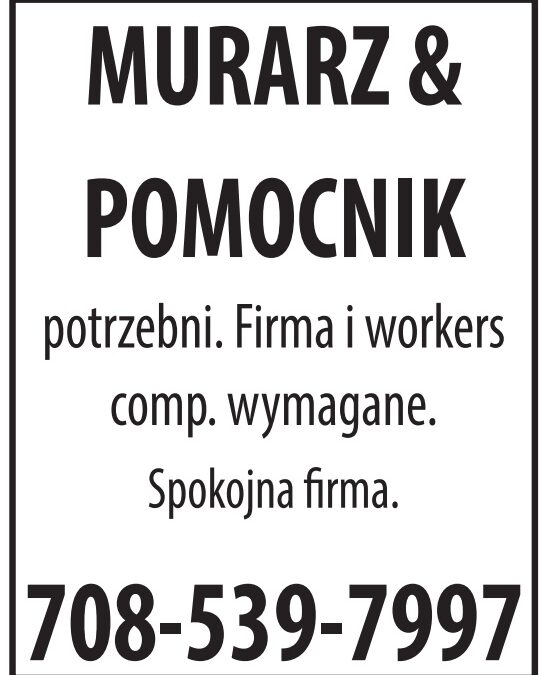 MURARZ & POMOCNIK utworzone przez QualityClassifiedArt | kwi 9, 2026 Budowlana MURARZ & POMOCNIK Dodał:QualityClassifiedArt 04/09/2026 Opis ogłoszeniapotrzebni. Firma i workers comp. wymagane. Spokojna firma. 708-539-7997 Udostępnij: Telefon(708) 539 7997 Udostępnij: