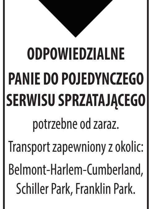ODPOWIEDZIALNE PANIE DO POJEDYNCZEGO SERWISU SPRZATAJĄCEGO utworzone przez QualityClassifiedArt | lut 10, 2026 Sprzątanie ODPOWIEDZIALNE PANIE DO POJEDYNCZEGO SERWISU SPRZATAJĄCEGO Dodał:QualityClassifiedArt 02/10/2026 Opis ogłoszeniapotrzebne od zaraz. Transport zapewniony z okolic: Belmont-Harlem-Cumberland, Schiller Park, Franklin Park. 630-421-0809 Telefon(630) 421 0809 Udostępnij: