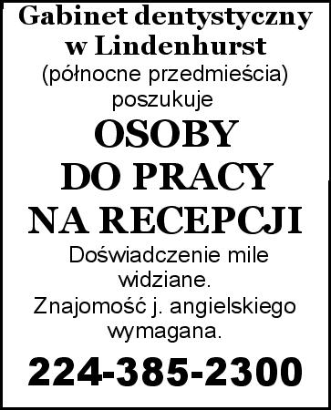 OSOBA DO PRACY NA RECEPCJI utworzone przez QualityClassifiedArt | kwi 8, 2026 Biurowa OSOBA DO PRACY NA RECEPCJI Dodał:QualityClassifiedArt 04/08/2026 Opis ogłoszeniaGabinet dentystyczny w Lindenhurst (północne przedmieścia) poszukuje osoby do pracy na recepcji. Doświadczenie mile widziane. Znajomość języka angielskiego wymagana. 224-385-2300 Udostępnij: Telefon(224) 385 2300 Udostępnij: