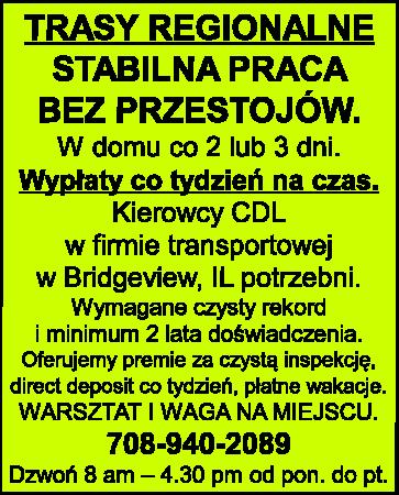 Stabilna praca bez przestojów. W domu co 2 lub 3 dni. Wypłatyco tydzień na czas. Kierowcy CDL w firmie transportowej w Bridgeview, IL potrzebni.