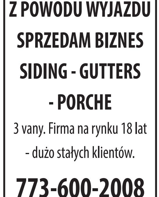 Z POWODU WYJAZDU SPRZEDAM BIZNES utworzone przez QualityClassifiedArt | sty 8, 2026 Interesy Z POWODU WYJAZDU SPRZEDAM BIZNES Dodał:QualityClassifiedArt 01/08/2026 Opis ogłoszeniaSIDING-GUTTERS-PORCHE 3 vany. Firma na rynku 18 lat – dużo stałych klientów. 773-600-2008 Udostępnij: Telefon(773) 600 2008 Udostępnij:
