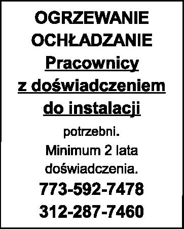Pracownicy z doświadczeniem do instalacji potrzebni. Minimum 2 lata doświadczenia. 773-592-7478, 312-287-7460