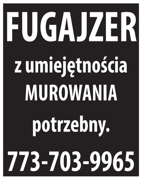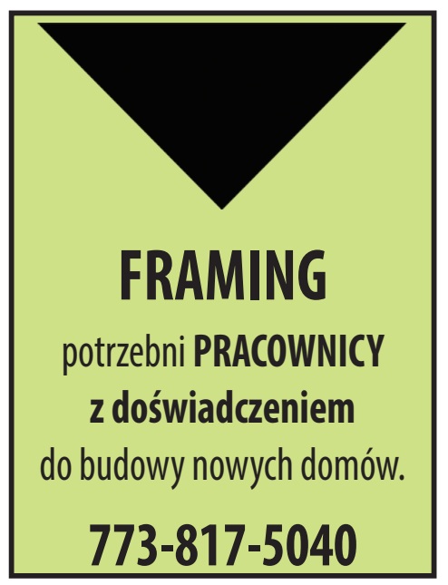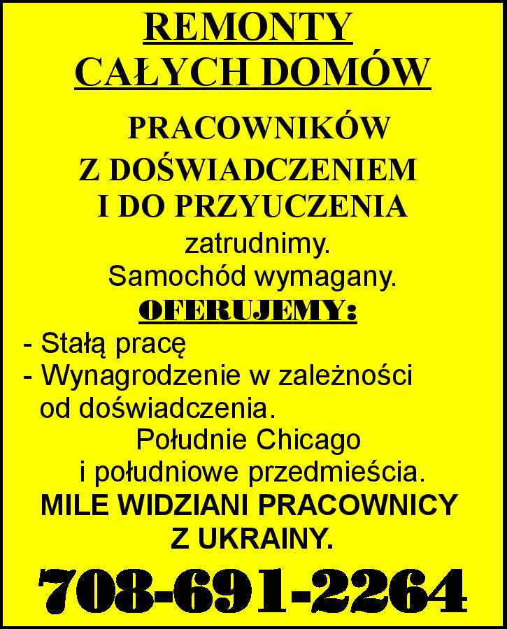 Budowa nowych domów. Stała praca na przedmieściach. J. polski lub ang. wymagany. Alkoholicy proszę nie dzwonić! 708-774-4899