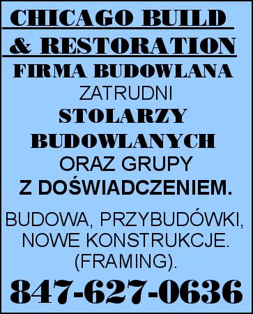 CHICAGO BUILD & RESTORATION FIRMA BUDOWLANA ZATRUDNI STOLARZY BUDOWLANYCH ORAZ GRUPY Z DOŚWIADCZENIEM. BUDOWA, PRZYBUDÓWKI, NOWE KONSTRUKCJE (FRAMING). 847-627-0636