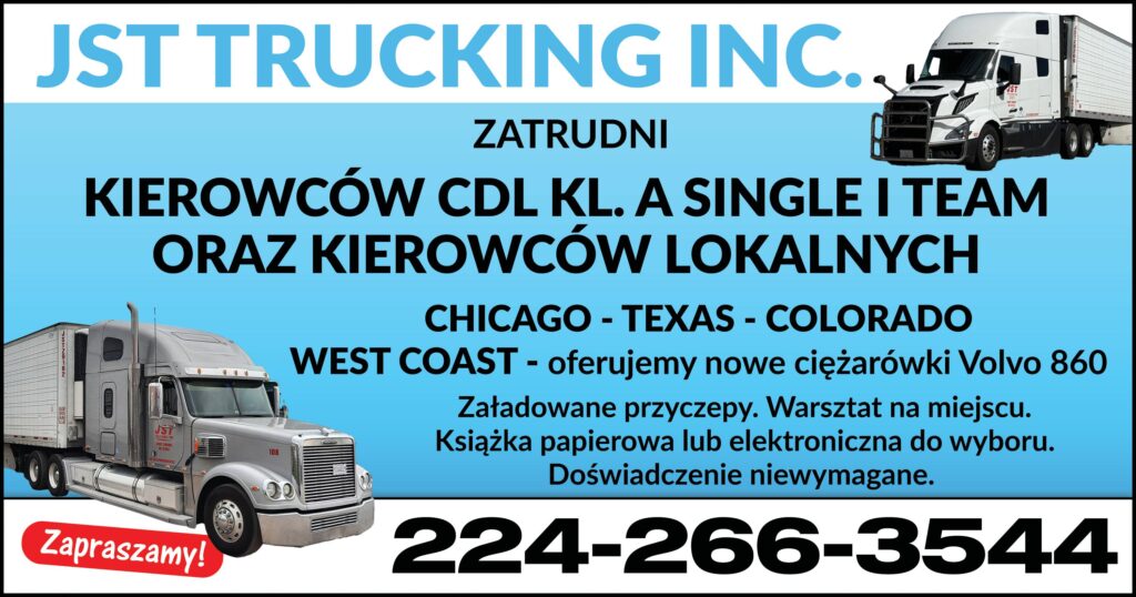 JST TRUCKING ZATRUDNI: KIEROWCÓW CDL KL. A SINGLE I TEAM ORAZ KIEROWCÓW LOKALNYCH CHICAGO - TEXAS - COLORADO WEST COAST- oferujemy nowe ciężarówki Volvo 860 Załadowane przyczepy.Warsztat na miejscu. Książka papierowa lub elektroniczna do wyboru. Doświadczenie niewymagane. ZAPRASZAMY! […]