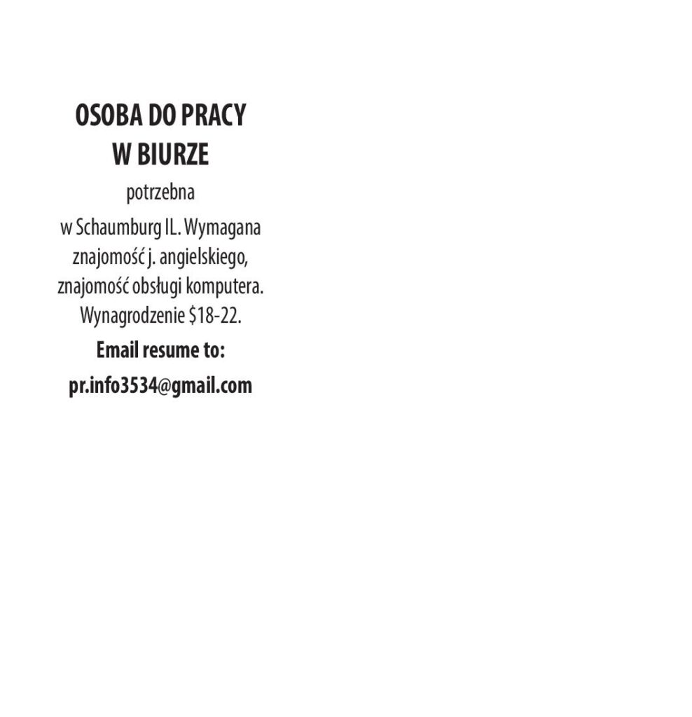 OSOBA DO PRACY W BIURZE POTRZEBNA. WYMAGANIA: - ZNAJOMOŚĆ J. ANGIELSKIEGO - ZNAJOMOŚĆ OBSŁUGI KOMPUTERA BENSENVILLE, IL Email resume to: [email protected]