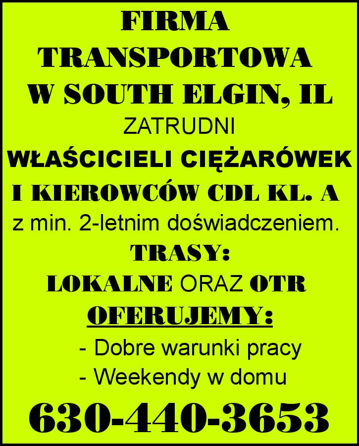 FIRMA TRANSPORTOWA W SOUTH ELGIN, IL ZATRUDNI WŁAŚCICIELI CIĘŻARÓWEK I KIEROWCÓW CDL KL. A z min. 2-letnim doświadczeniem. TRASY; LOKALNE ORAZ OTR OFERUJEMY: - Dobre warunki pracy - Weekendy w domu 630-440-3653
