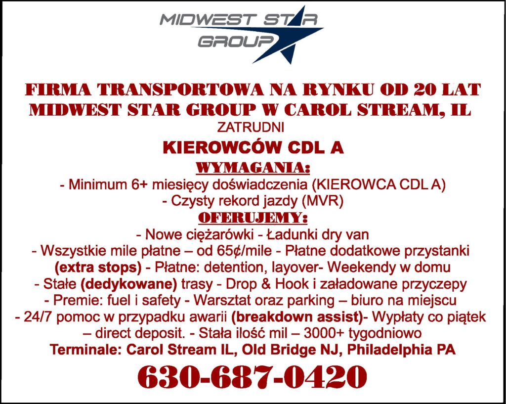 FIRMA TRANSPORTOWA MIDWEST STAR GROUP W CAROL STREAM, IL ZATRUDNI KIEROWCÓW CDL A WYMAGANIA: - Minimum 6+ miesięcy doświadczenia (KIEROWCA CDL A - Czysty rekord jazdy (MVR) OFERUJEMY: - Nowe ciężarówki - Ładunki dry van - Wszystkie mile płatne – od 65¢/mile - Płatne dodatkowe przystan […]