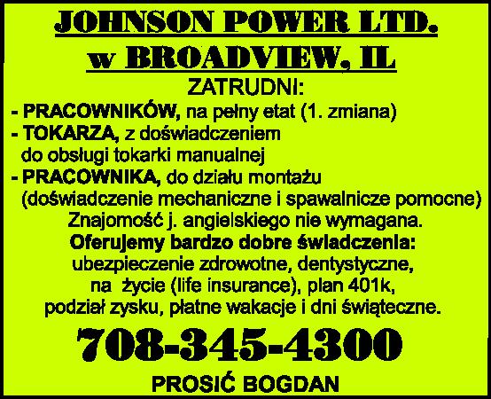 JOHNSON POWER LTD. w BROADVIEW, IL ZATRUDNI: - PRACOWNIKÓW na pełny etat (1. zmiana) - TOKARZA z doświadczeniem do obsługi tokarki manualnej - PRACOWNIKA do działu montażu (doświadczenie mechaniczne i spawalnicze pomocne) Znajomość j. angielskiego nie wymagana. Oferujemy bardzo do […]