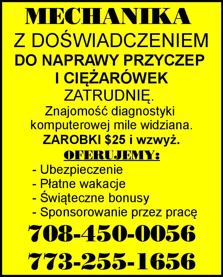 MECHANIKA Z DOŚWIADCZENIEM DO NAPRAWY PRZYCZEP I CIĘŻARÓWEK ZATRUDNIĘ. Znajomość diagnostyki komputerowej mile widziana. . ZAROBKI $25 i wzwyż. OFERUJEMY: - Ubezpieczenie - Płatne wakacje - Świąteczne bonusy - Sponsorowanie przez pracę 708-450-0056 773-255-1656