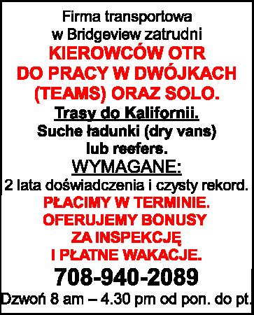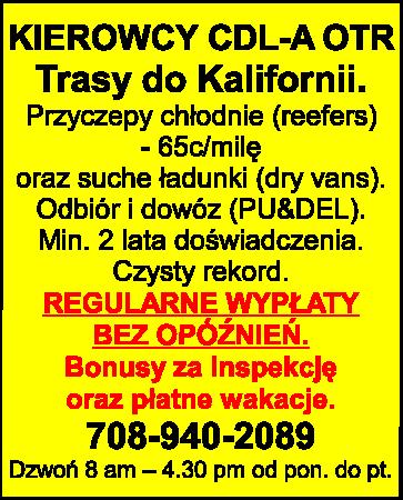 KIEROWCY CDL-A OTR. Trasy do Kalifornii. Przyczepy chłodnie (reefers) - 65c/milę oraz suche ładunki (dry vans). Odbiór i dowóz (PU&DEL). Min. 2 lata doświadczenia. Czysty rekord. REGULARNE WYPŁATY BEZ OPÓŹNIEŃ. Bonusy za inspekcję oraz płatne wakacje. 708-940-2089 Dzwoń 8 am – 4.30 pm od pon. do pt.