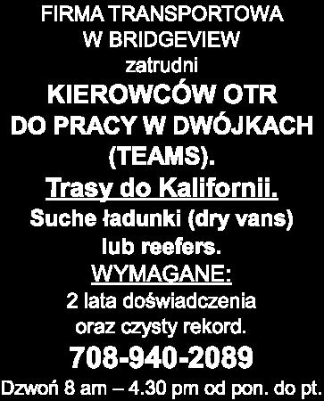 FIRMA TRANSPORTOWA W BRIDGEVIEW zatrudni KIEROWCÓW OTR DO PRACY W DWÓJKACH (TEAMS). Trasy do Kalifornii. Suche ładunki (dry vans) lub reefers. WYMAGANE: 2 lata doświadczenia oraz czysty rekord. 708-940-2089 Dzwoń 8 am – 4.30 pm od pon. do pt.