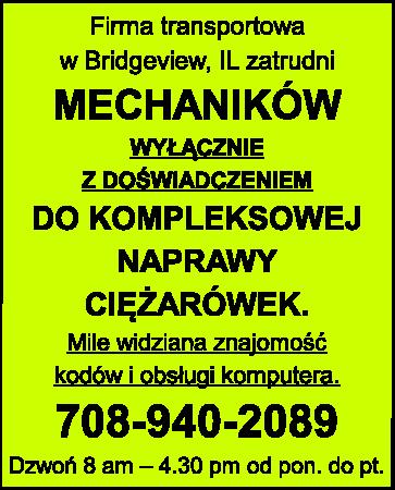 WYŁĄCZNIE Z DOŚWIADCZENIEM DO KOMPLEKSOWEJ NAPRAWY CIĘŻARÓWEK. Mile widziana znajomość kodów i obsługi komputera. 708-940-2089 Dzwoń 8 am - 4.30 pm od pon. do pt.